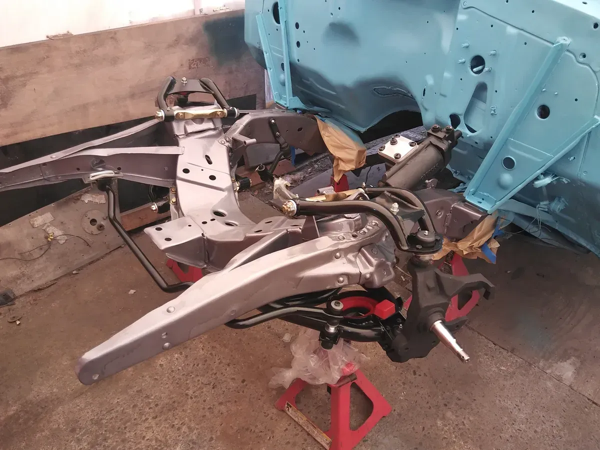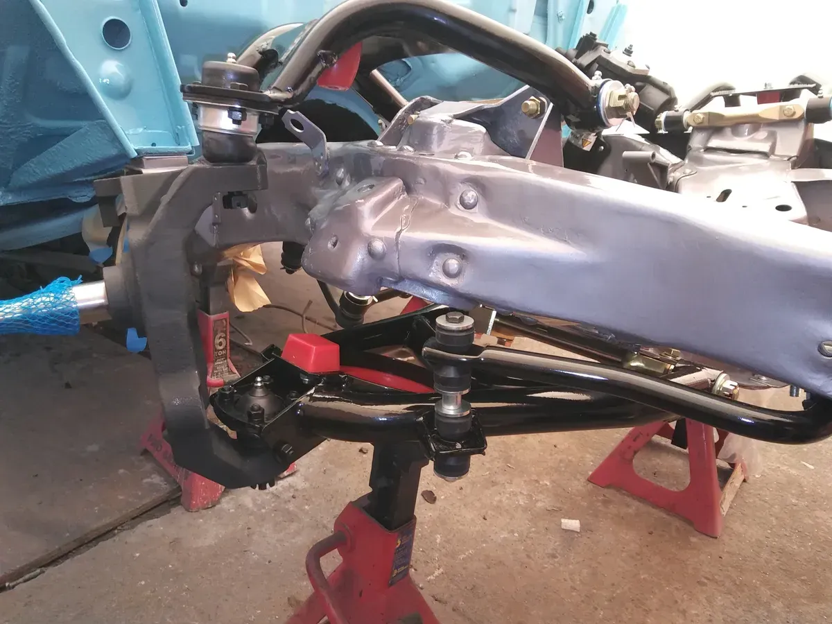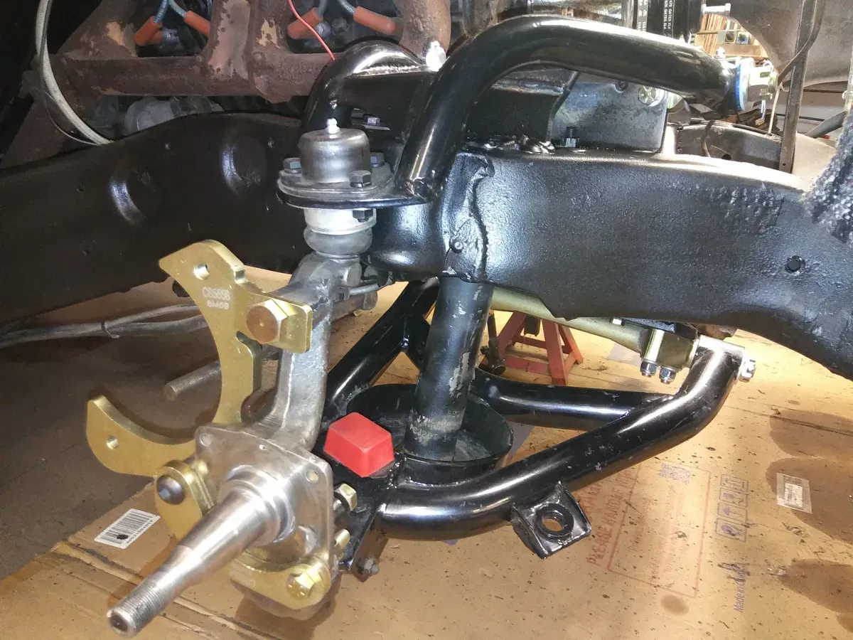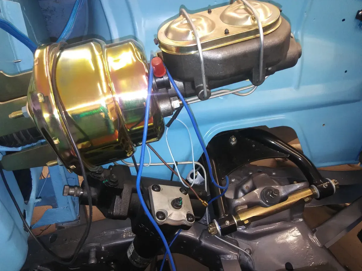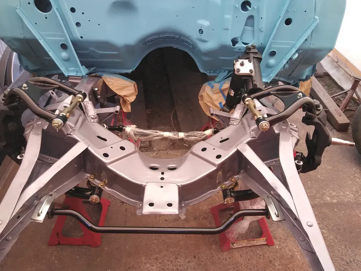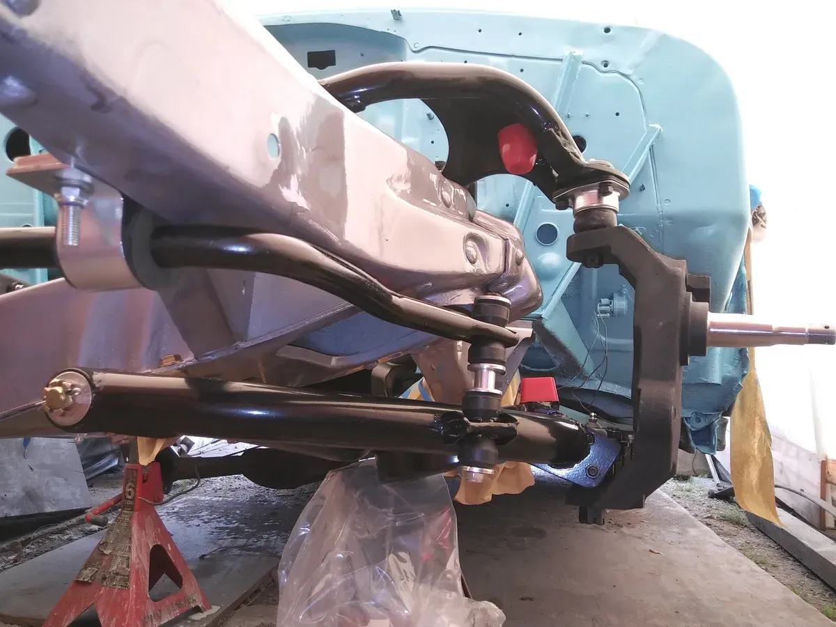 We added a new Mustang II–style front end with power disc brakes, power steering, upgraded suspension, tilt wheel, and more.