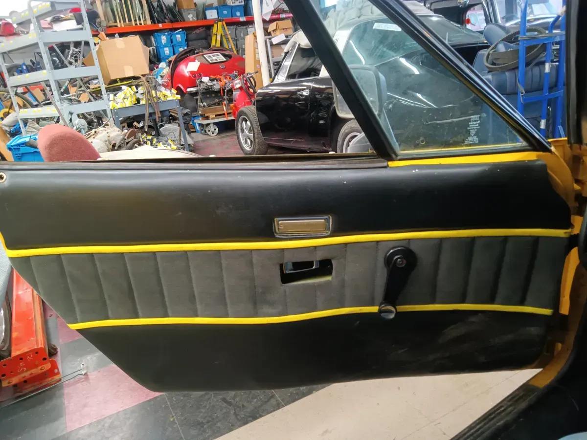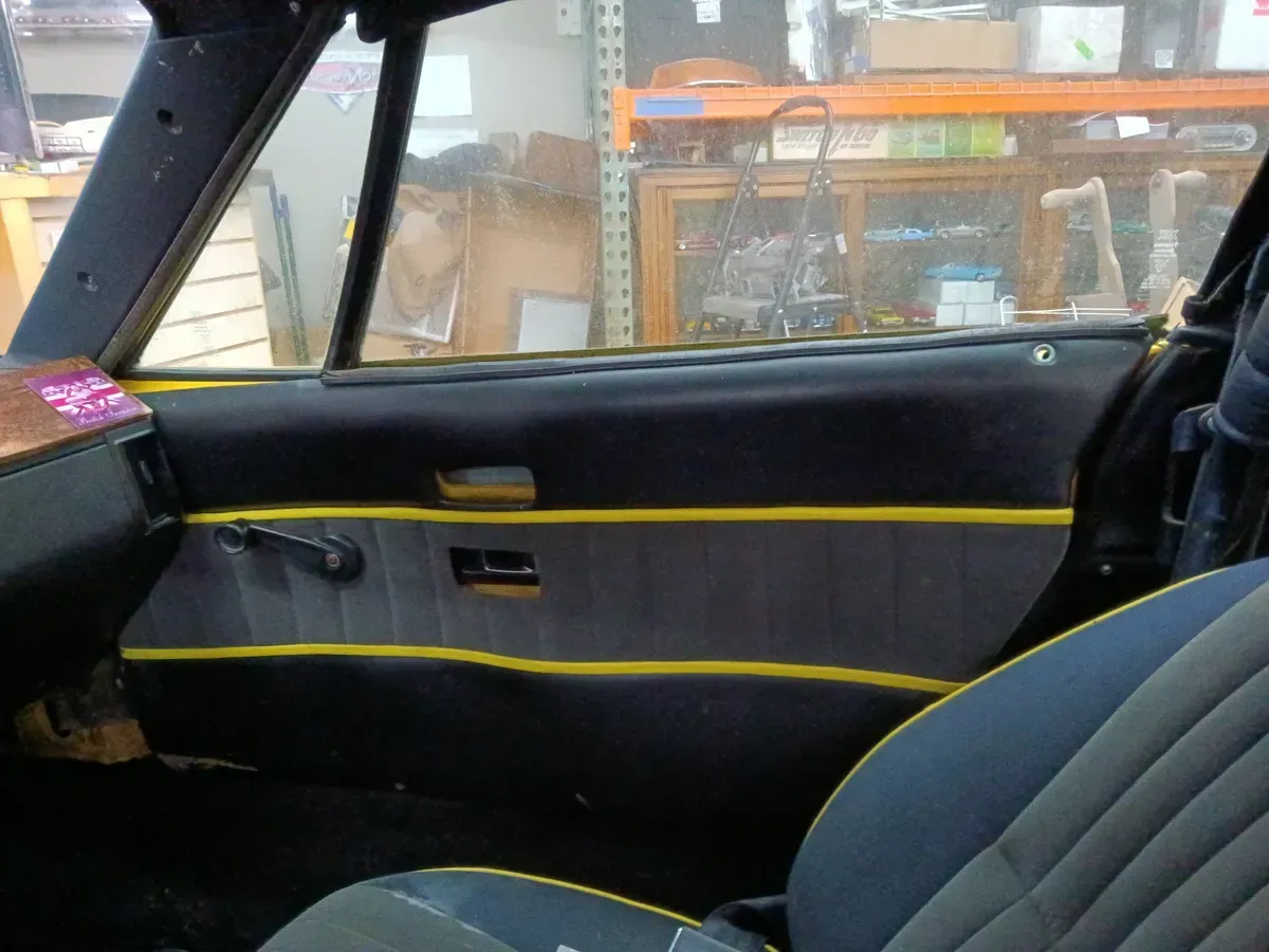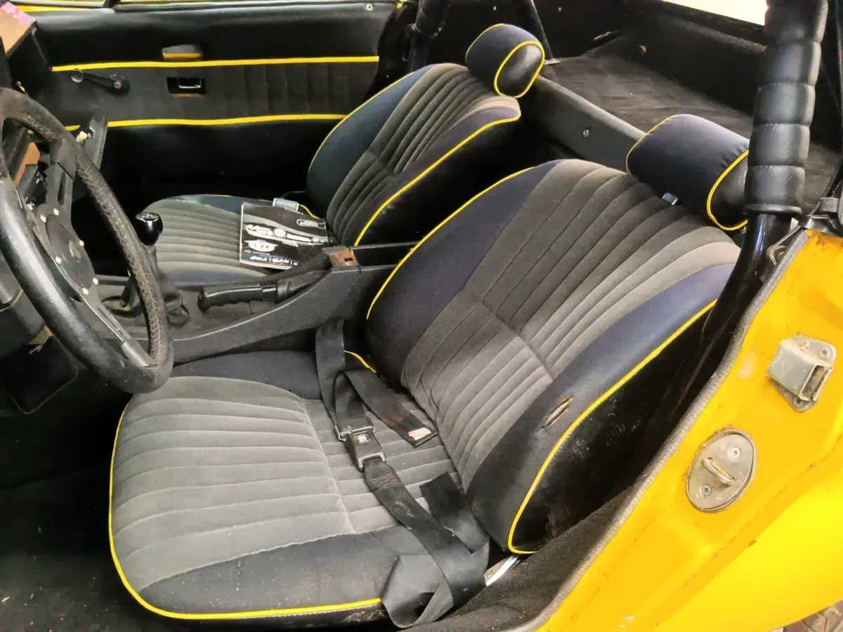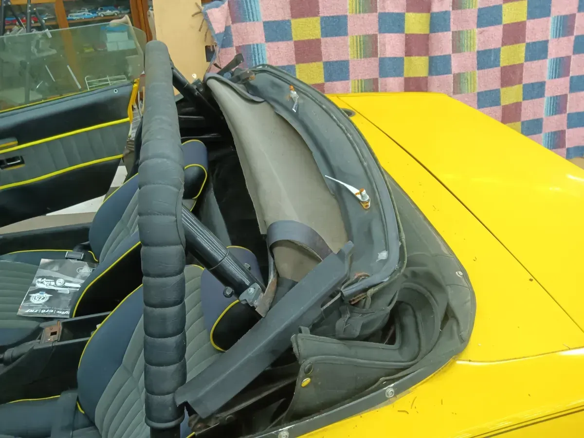 The car is finished in factory FAB Yellow over a black interior with yellow accents. Additional equipment includes a five-speed manual transmission, tubular headers, a padded roll bar, TR8-style rear battery relocation, dual exhaust system, Panasport wheels, an upgraded black canvas soft top, and a new clutch master cylinder installed in December 2025. The engine compartment would benefit from cleaning and detailing.